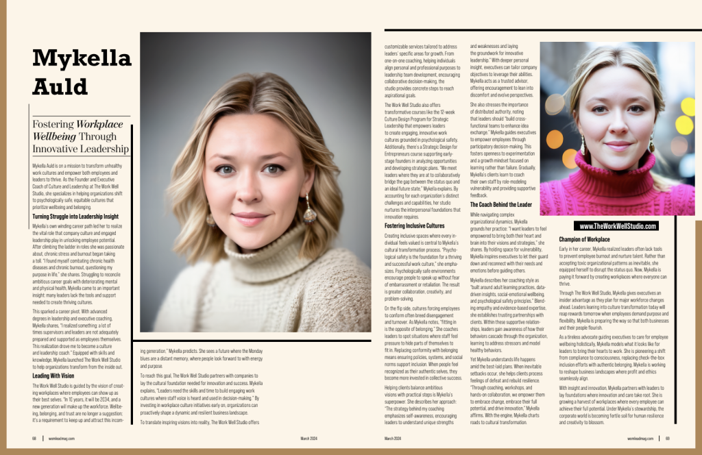 - In 2024, WomLEAD Magazine named Mykella Auld to their Top 25 Women Leaders list for her trailblazing work in organizational well-being and culture transformation. The feature highlights her journey from burnout to founding The Work Well Studio, and her innovative, equity-centered approach to leadership development and workplace care. https://www.womleadmag.com/mykella-auld-fostering-workplace-wellbeing-through-innovative-leadership